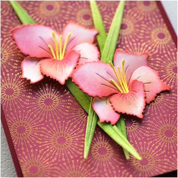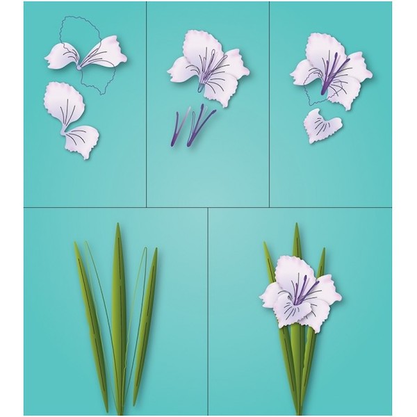 Gladiola Blossom and Leaves Die from Memory Box, 1 die included, cuts out 8 designs. Approximate size 2.1 x 2 inches gladiola assembled, 0.4 x 5.3, 0.2 x 4.1, 0.3 x 4.5 inches leaves
