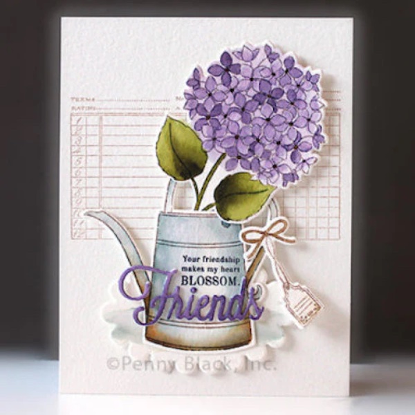 Hydrangeas Stamp and Die Combo from Penny Black, includes 5 x 6.5 inch clear Hydrangeas stamp set and coordinating die set. Sentiments included: Hydrangea, Wishing you Gratitude, Grace and Abundance. Coordinates beautifully with Sprinkles Stamp and Die Combo, featured in the sample cards.
