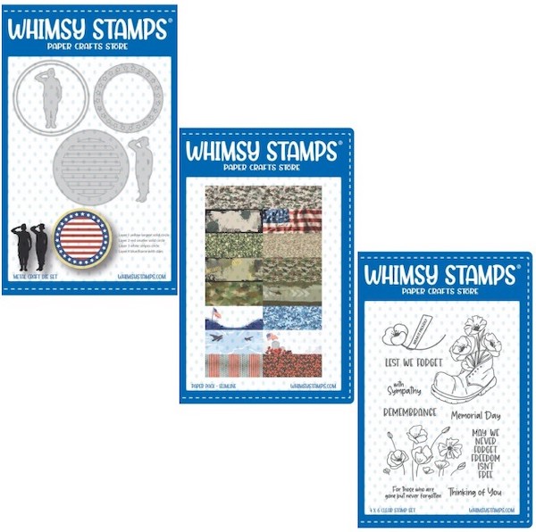 Poppy Remembrance Patriotic Combo, from Whimsy Stamps, includes Poppy Remembrance Clear Stamp Set, Military Sheroes Die Set and Patriotic themed slimline paper pack.