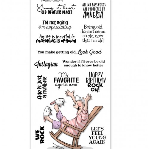 This clear stamp set features a blue-haired party animal in her rocking chair, having a blast! Sentiments include : “Young at heart Old in other Places”, “All my passwords are protected by amnesia”, “I’m not aging, I’m appreciating”, “Being old doesn’t seem so old, now that I’m old”, “You make getting old Look Good”, “Instagran”, “Wonder if I’ll ever be old enough to know better”, “Age is just a number”, “My favorite age is now”, “Happy birthday rock on!”, “We rock”, “Let’s feel young again”.